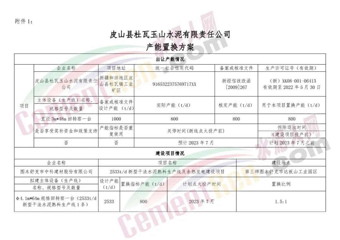 7月29日,新疆工信廳發(fā)布《皮山縣杜瓦玉山水泥有限責(zé)任公司產(chǎn)能置換方案公示》,方案中明確皮山縣杜瓦玉山水泥有限責(zé)任公司將出讓800t/d熟料產(chǎn)能給圖木舒克市中科建材股份有限公司,用于將新建一條2533t/d新型干法水泥熟料生產(chǎn)線,置換比例為1.5:1,新建生產(chǎn)線擬于2023年7月點(diǎn)火投產(chǎn),公示期為7月29日至8月5日。