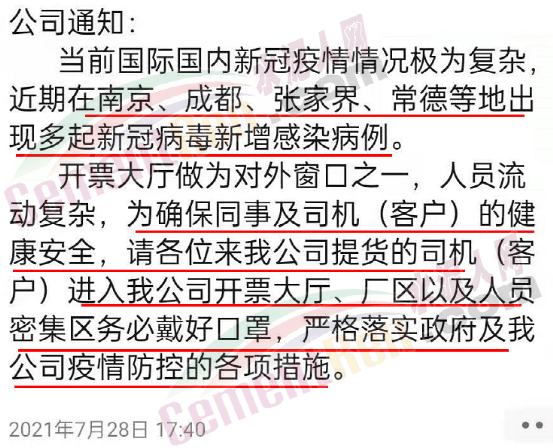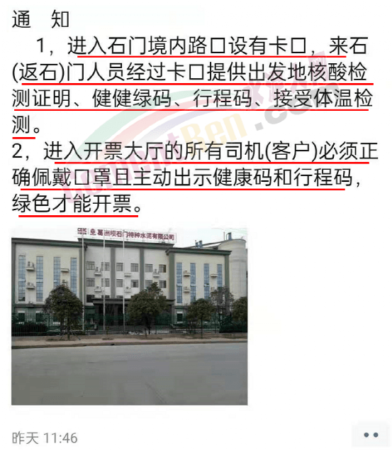 據(jù)水泥人網(wǎng)了解,企業(yè)近兩日連續(xù)發(fā)布提示通知,提示車(chē)輛進(jìn)入石門(mén)境內(nèi)路口設(shè)有卡口,來(lái)往人員經(jīng)過(guò)卡口需提供出發(fā)地核酸檢驗(yàn)證明、健康綠碼、行程碼并接受體溫檢測(cè)。同時(shí)進(jìn)入開(kāi)票大廳的所有司機(jī)(客戶)必須正確佩戴口罩,主動(dòng)出示健康碼,行程碼,綠色才能開(kāi)票。