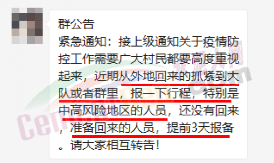 據(jù)上述銷(xiāo)售人員反饋,村里發(fā)了緊急通知稱,接到上級(jí)通知,要求從外地回村的人員抓緊報(bào)備行程,特別是從中高風(fēng)險(xiǎn)地區(qū)返回的人員。還沒(méi)有回來(lái)的,準(zhǔn)備回來(lái)的人員,提前3天報(bào)備。