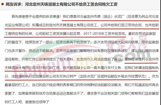 2021年7月20日,有網(wǎng)友在陽光理政平臺反映,河北省定州市原(國企)水泥廠(后變更為民企河北寶光實業(yè)有限公司)所屬成立的定州市天鑄混凝土有限公司,未給職工簽訂勞動合同,也未給職工繳納應(yīng)有的社保,公司起初工資發(fā)放算比較正常,但2017-2018年工資未給發(fā)放。