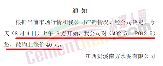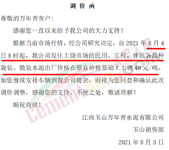 江西玉山萬年青水泥有限公司通知8月4日8時起,發(fā)往上饒市場的民用、工程、拌站各品種袋裝、散裝水泥出廠價格在原有價格基礎(chǔ)上上調(diào)40元/噸。
