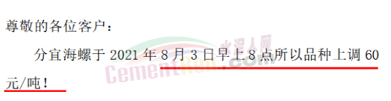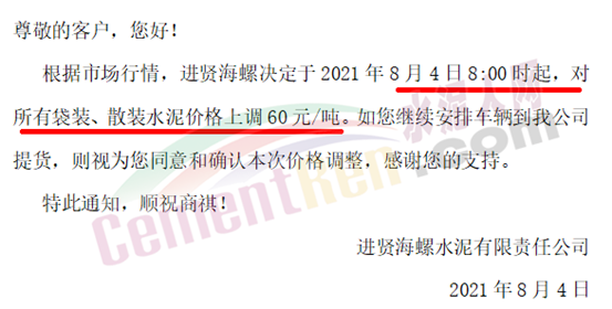 進(jìn)賢海螺水泥有限責(zé)任公司通知,于2021年8月4日8時起,對所有袋裝、散裝水泥價格上調(diào)60元/噸。