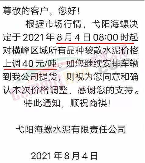 弋陽海螺通知自8月4日8時起對橫峰區(qū)域所有品種袋散裝水泥價格上調(diào)40元/噸。