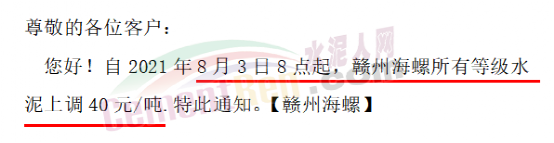 贛州海螺通知,自8月3日8點起所有等級水泥上調(diào)40元/噸。