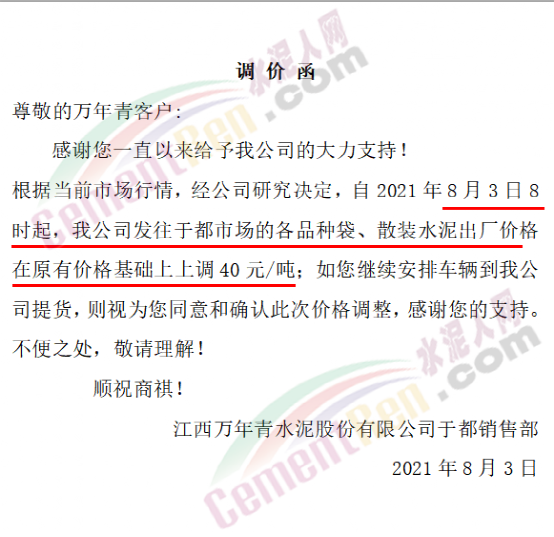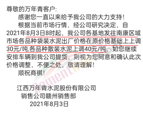 江西萬年青水泥股份有限公司贛州銷售部通知,根據(jù)當(dāng)前市場行情,經(jīng)公司研究決定,自8月3日8時起,公司各基地發(fā)往贛州市南康區(qū)域市場各品種袋裝水泥出廠價格在原價格基礎(chǔ)上上調(diào)30元/噸,各品種散裝水泥上調(diào)40元/噸。
