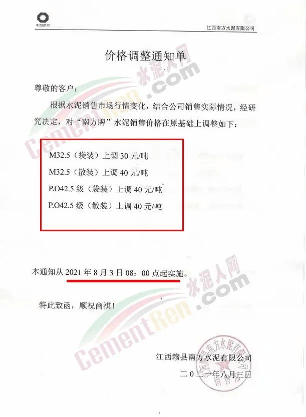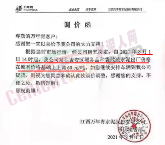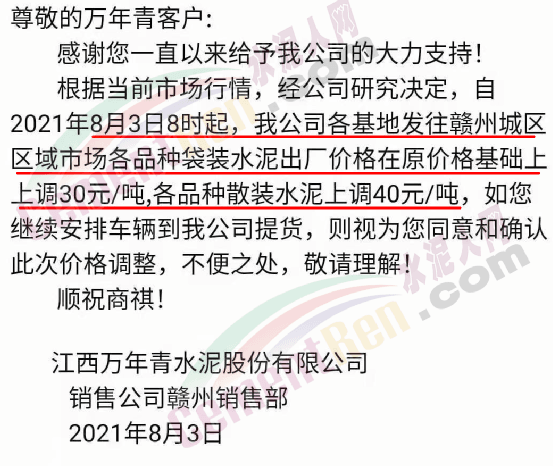江西萬年青江西贛州興國縣銷售部通知,自8月1日14時起,公司發(fā)往吉安區(qū)域各品種袋散裝水泥出廠價格在原有基礎(chǔ)上上調(diào)60元/噸。