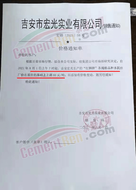 吉安宏光實業(yè)有限公司銷售部通知根據(jù)目前市場行情。結(jié)合公司實際,經(jīng)集團(tuán)公司市場部研究決定,自8月1日上午7時起,吉安宏光生產(chǎn)的“紅獅牌”各規(guī)格品種水泥出廠價在原價基礎(chǔ)上上調(diào)60元/噸。