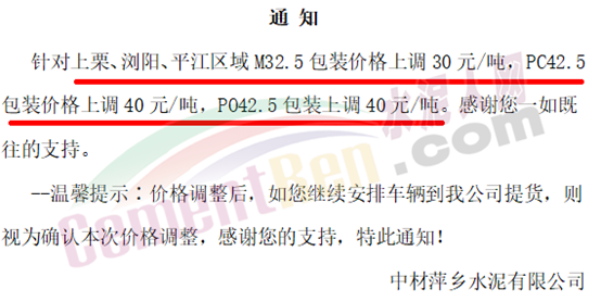 中材萍鄉(xiāng)水泥通知,針對上栗、瀏陽、平江區(qū)域M32.5包裝價格上調(diào)30元/噸,PC42.5包裝價格上調(diào)40元/噸,PO42.5包裝上調(diào)40元/噸。