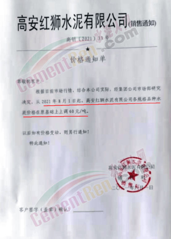 宜春高安紅獅水泥通知根據(jù)目前市場行情,結(jié)合公司實際,經(jīng)集團(tuán)公司市場部研究決定,自8月1日起,各規(guī)格品種水泥價格在原基礎(chǔ)上上調(diào)60元/噸。