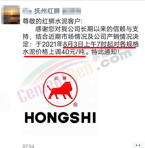 江西撫州紅獅水泥通知自8月3日上午7時起,對各規(guī)格水泥價格上調(diào)40元/噸。