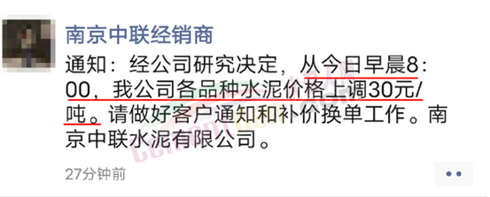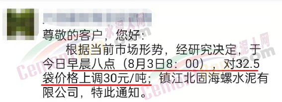 南京中聯(lián)水泥有限公司通知,經(jīng)公司研究決定從8月4日早8時起各品種水泥上調(diào)30元/噸。