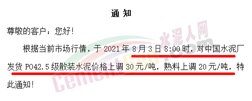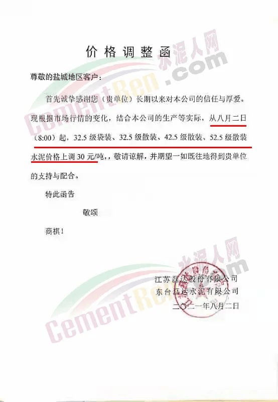 江蘇磊達(dá)水泥通知鹽城地區(qū)客戶,從8月2日8時起,32.5級、42.5級水泥價格上調(diào)30元/噸。