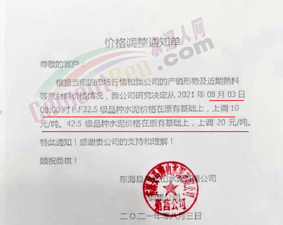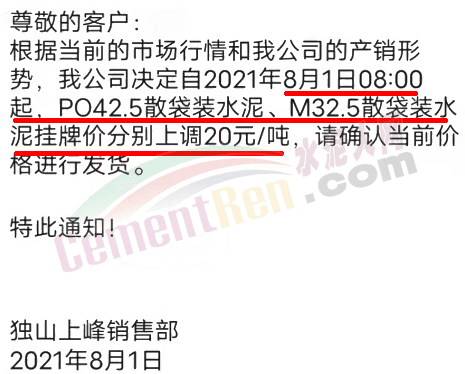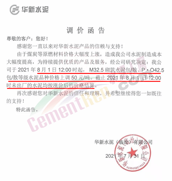 華新水泥(臨滄)有限公司通知由于煤炭等原燃材料價格大幅度上漲,造成公司水泥制造成本大幅度提高,為持續(xù)提供優(yōu)質(zhì)的產(chǎn)品及服務(wù),經(jīng)研究決定于2021年8月1日12時起,M325砌筑水泥包/散、P·O42.5包/散等級水泥品種價格上調(diào)50元/噸。