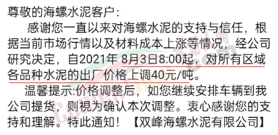 湖南省婁底市雙峰海螺水泥通知,根據(jù)當(dāng)前市場行情以及材料成本上漲等情況,經(jīng)公司研究決定,自8月3日8時起,對所有區(qū)域各品種水泥的出廠價格上調(diào)40元/噸。