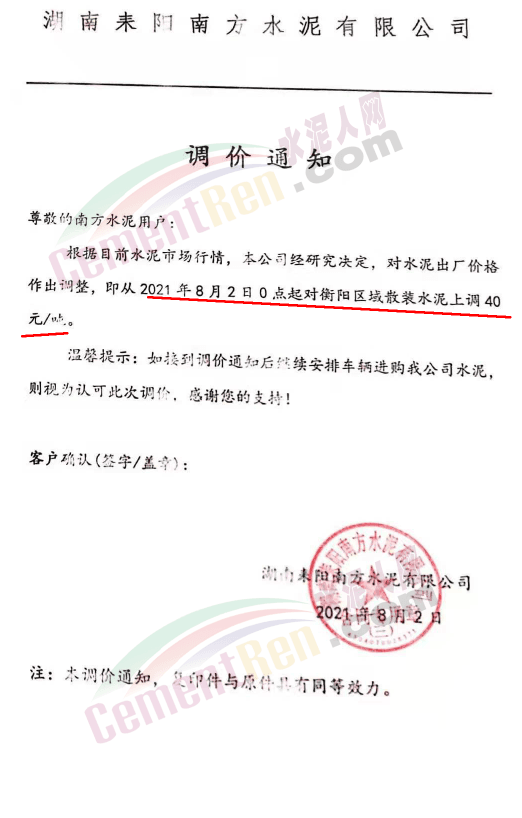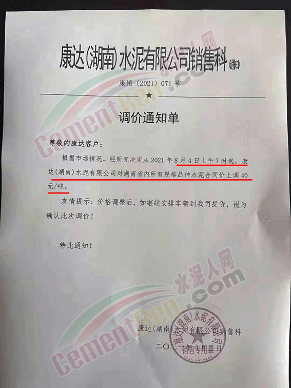 湖南郴州市宜章縣康達(dá)湖南水泥有限公司銷售科發(fā)調(diào)價通知單稱:根據(jù)市場情況,經(jīng)研究決定從8月4日上午7時起,康達(dá)(湖南)水泥有限公司對湖南省內(nèi)所有規(guī)格品種水泥合同價上調(diào)40元/噸。