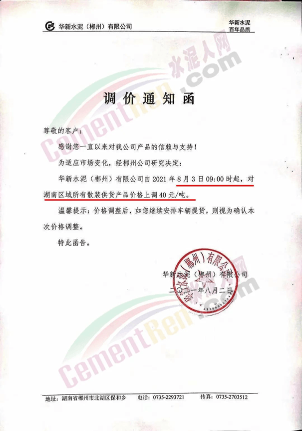 華新水泥(郴州)有限公司自8月3日上午9時起,對湖南區(qū)域所有散裝供貨產(chǎn)品價格上調(diào)40元/噸。