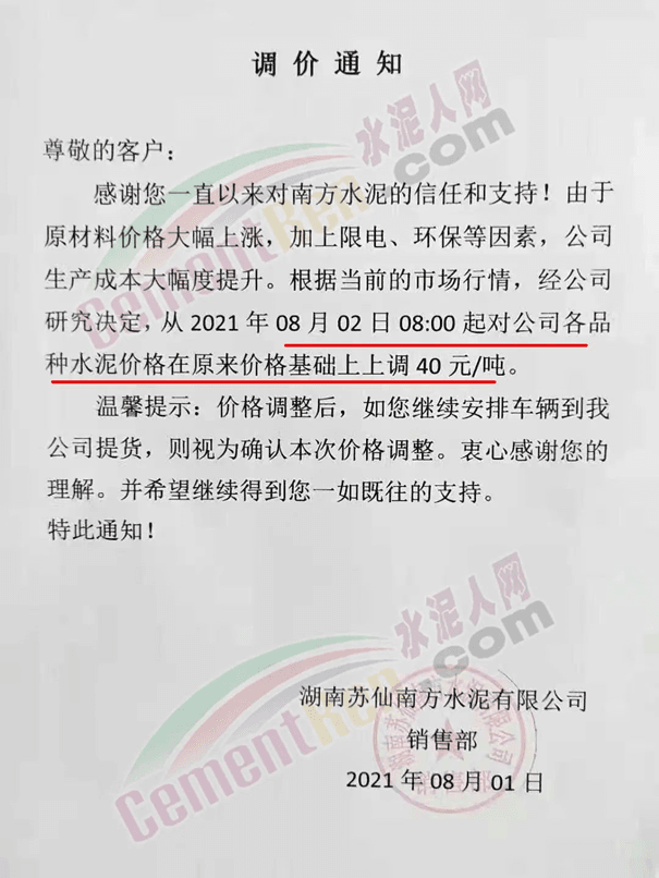 湖南郴州市蘇仙區(qū)南方水泥有限公司調(diào)價通知稱,由于原材料價格大幅上漲,加上限電、環(huán)保等因素,公司生產(chǎn)成本大幅度提升。根據(jù)當(dāng)前的市場行情,經(jīng)公司研究決定,從8月2日8時起對公司各品種水泥價格在原來價格基礎(chǔ)上上調(diào)40元/噸。