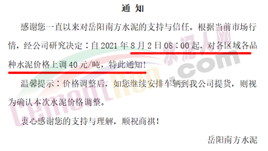 岳陽南方水泥通知8月2日8時起,對各區(qū)域各品種水泥價格上調(diào)40元/噸。