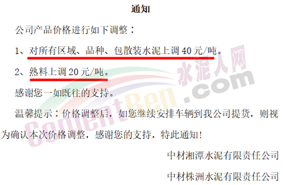 中材湘潭水泥有限責(zé)任公司(中材株洲水泥有限責(zé)任公司)通知對所有區(qū)域、品種、包散裝水泥上調(diào)40元/噸。熟料上調(diào)20元/噸。