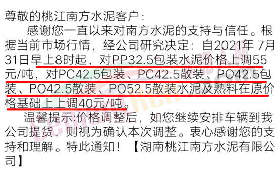 桃江南方水泥通知根據(jù)當(dāng)前市場行情,經(jīng)研究決定∶自7月31日早上8時起,對PP32.5包裝水泥價格上調(diào)55元/噸,對PC42.5包裝、PC42.5散裝、PO42.5包裝、PO42.5散裝、PO52.5散裝水泥及熟料在原價格基礎(chǔ)上上調(diào)40元/噸。