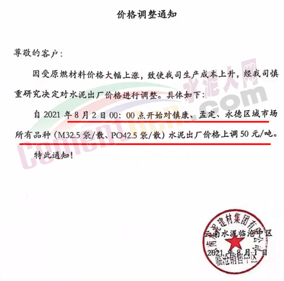 云南建材集團(tuán)臨滄中區(qū)通知,因受原燃材料價格大幅上漲,致使生產(chǎn)成本上升,經(jīng)公司慎重研究決定對水泥出廠價格進(jìn)行調(diào)整。自8月2日0時起對鎮(zhèn)康、孟定、永德區(qū)域市場所有品種(M32.5袋/散PO42.5袋/散)水泥出廠價格上調(diào)50元/噸。