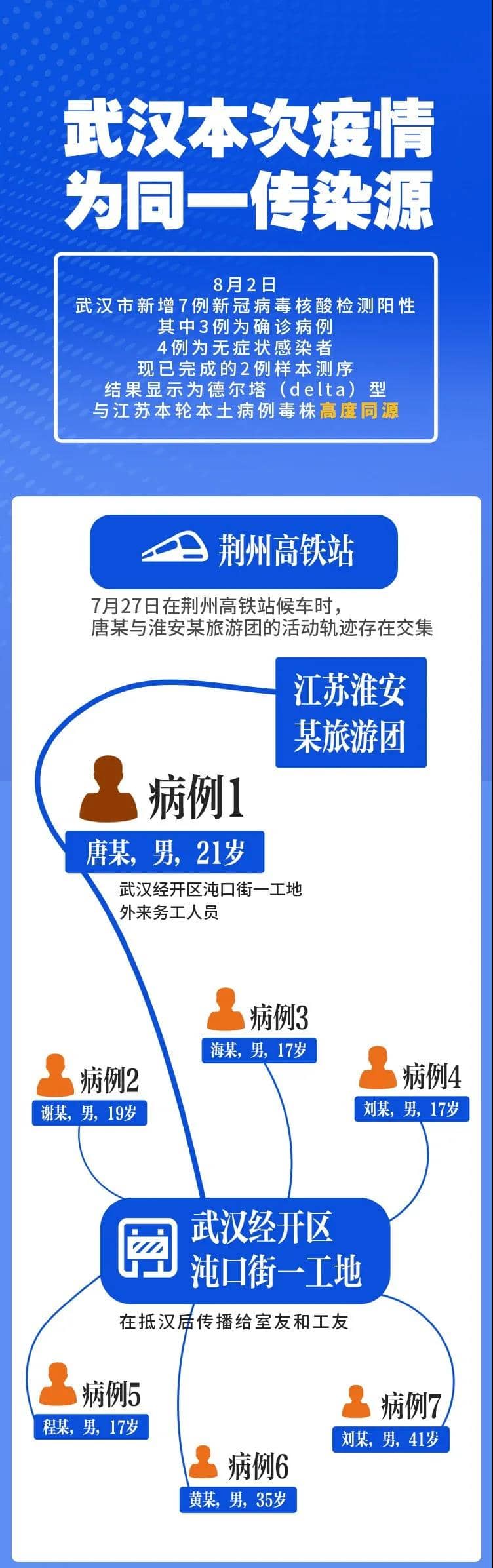 2021年8月1日晚,武漢經(jīng)開(kāi)區(qū)對(duì)江蘇淮安某旅游團(tuán)途經(jīng)的重點(diǎn)區(qū)域駐留人員進(jìn)行了排查,發(fā)現(xiàn)沌口街一工地外來(lái)務(wù)工人員唐某,曾于7月27日在荊州高鐵站候車(chē)時(shí),與淮安某旅游團(tuán)的活動(dòng)軌跡存在交集。該區(qū)立即對(duì)其進(jìn)行新冠病毒核酸檢測(cè),8月2日上午,唐某檢測(cè)結(jié)果顯示為陽(yáng)性。