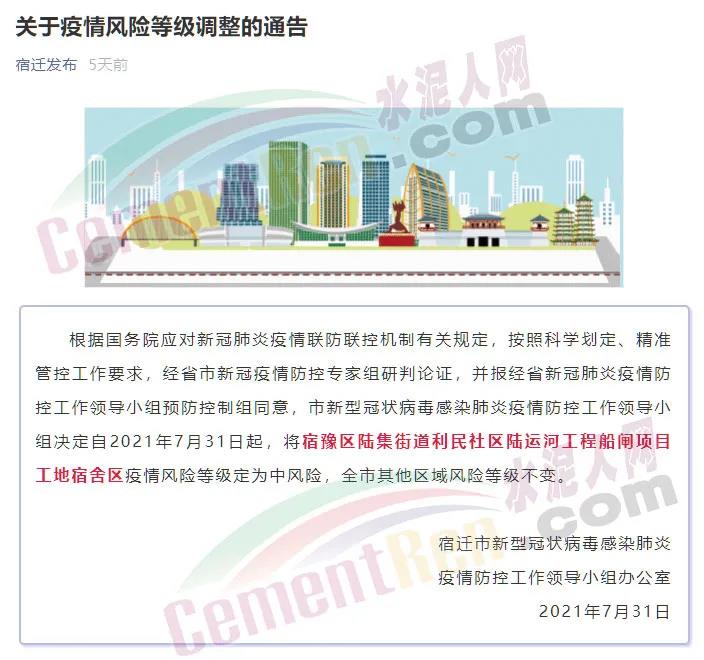 7月30日,江蘇宿遷一工地宿舍確診1例新冠肺炎病例,7月31日,將該宿舍區(qū)疫情風(fēng)險(xiǎn)等級(jí)定為中風(fēng)險(xiǎn)。
