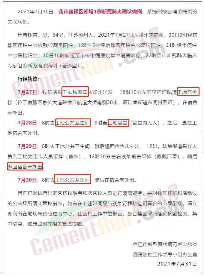 江蘇宿遷一工地宿舍確診1例新冠肺炎病例