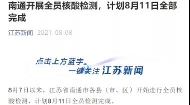 江蘇南通:8月7日以來(lái),江蘇省南通市各縣(市)區(qū)開(kāi)始進(jìn)行全員核酸檢測(cè),計(jì)劃8月11日全員檢測(cè)完成。