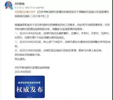 河南開(kāi)封:自2021年8月8日起,將尉氏縣莊頭鎮(zhèn)前曹村、后曹村、于家村、文家村、劉家村、孫莊村、田家村等7個(gè)地區(qū)調(diào)整為高風(fēng)險(xiǎn)地區(qū);除上述7個(gè)地區(qū)外,將尉氏縣莊頭鎮(zhèn)其他區(qū)域調(diào)整為中風(fēng)險(xiǎn)地區(qū)。對(duì)尉氏縣全域執(zhí)行防控區(qū)管理,暫停與外界人員往來(lái)。