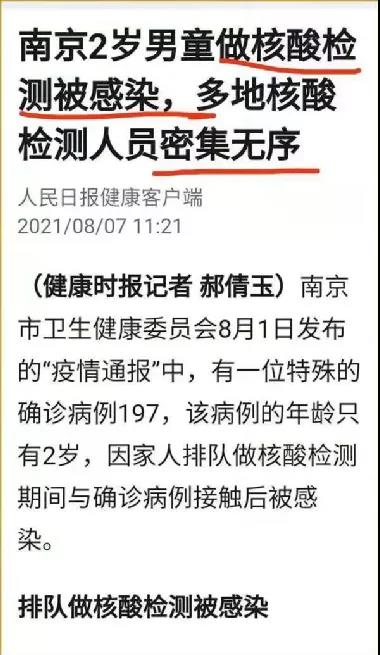 多地群眾反應(yīng),檢測(cè)現(xiàn)場(chǎng)亂糟糟的一堆人擁擠推搡,進(jìn)展緩慢且隊(duì)伍越來(lái)越長(zhǎng),部分熟人一同排隊(duì)不戴口罩還唾沫橫飛的聊天,哪顧得什么“一米線(xiàn)”的限制。南京某2歲男童隨家人排隊(duì)做核酸檢測(cè),期間家人與鄰居有近距離交談(接觸確診病例),后隨家人與另一鄰居在家后院交談(接觸確診病例),此后被診斷為新冠肺炎確診病例,讓人倒吸一口涼氣。
