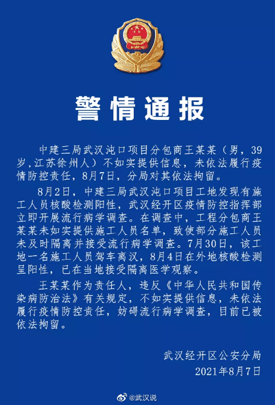 8月7日,武漢經(jīng)開區(qū)公安分局發(fā)布警情通報:中建三局武漢沌口項目分包商王某某(男,39歲,江蘇徐州人)不如實提供信息,未依法履行疫情防控責任,8月7日,分局對其依法拘留。