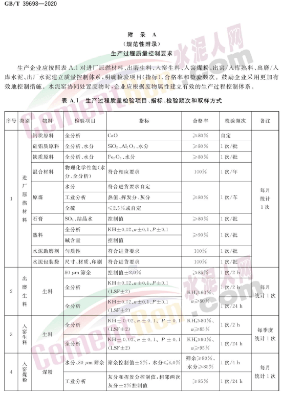 標(biāo)準(zhǔn)附錄中給出了出磨/入庫(kù)水泥以及出廠水泥質(zhì)量檢驗(yàn)項(xiàng)目、指標(biāo)、檢驗(yàn)頻次和取樣方式要求。
