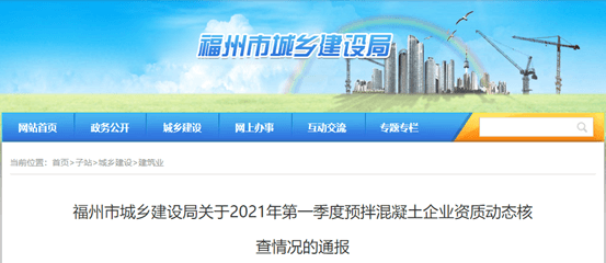 福州城鄉(xiāng)建設局《關于2021年第一季度預拌混凝土企業(yè)資質(zhì)動態(tài)核查情況的通報》