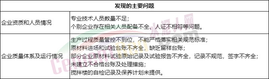 本次檢查中企業(yè)質(zhì)量保證體系運營情況及人員配備比較差的單位給予通報批評:1、溫州銀龍建筑材料銷售有限公司;2、樂清市州際混凝土有限公司。