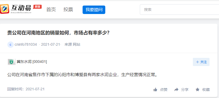 據(jù)水泥人網(wǎng)了解,此前有投資者在上市公司平臺(tái)向冀東水泥提問(wèn)題,公司在河南地區(qū)的銷量如何,市場(chǎng)占有率多少?上市公司回復(fù)稱,“公司在河南省焦作市下屬的沁陽(yáng)市和博愛縣有兩家水泥企業(yè),生產(chǎn)經(jīng)營(yíng)情況正常。”
