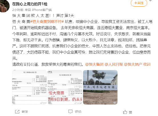 有網(wǎng)友在社交平臺(tái)上留言稱,恒大商票到期未付,令企業(yè)工資無法發(fā)出,被工人堵門,被逼賤賣機(jī)器設(shè)備。去年無奈收恒大商票,連云港恒大置業(yè),南京恒大富豐。今年到期,逾期卻遲遲不付,溝通幾個(gè)月基本無效。
