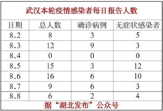 8月8日0時-24時,全省新增新冠肺炎本土確診病例3例(武漢市2例,荊門市1例)。全省新增本土無癥狀感染者4例(均為武漢市報告)。新增病例均為中建三局武漢沌口項目工地關(guān)聯(lián)人員,均與江蘇淮安某旅行團(tuán)確診病例關(guān)聯(lián)。截至8月8日,通過流行病學(xué)調(diào)查,排查出中建三局武漢沌口項目工地感染者的密切接觸者2719人,已經(jīng)全部實行集中隔離醫(yī)學(xué)觀察。