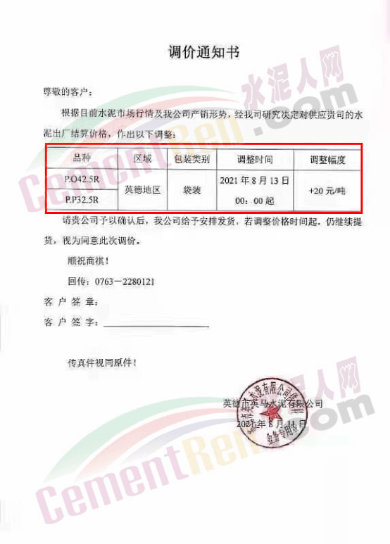 英德市粵華水泥有限責(zé)任公司通知自8月13日0時起,公司旗下PC42.5包裝及PSA32.5R包裝水泥出廠價上調(diào)20元/噸。