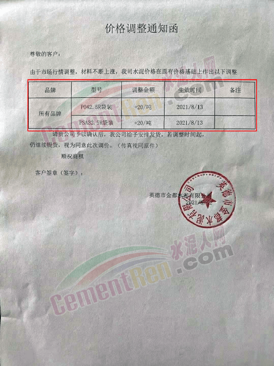 英德市金都水泥有限公司通知由于市場行情調(diào)整,材料不斷上漲,自8月13日起公司PO42.5R及PSA32.5R袋裝水泥價格在原有價格基礎(chǔ)上上調(diào)20元/噸。