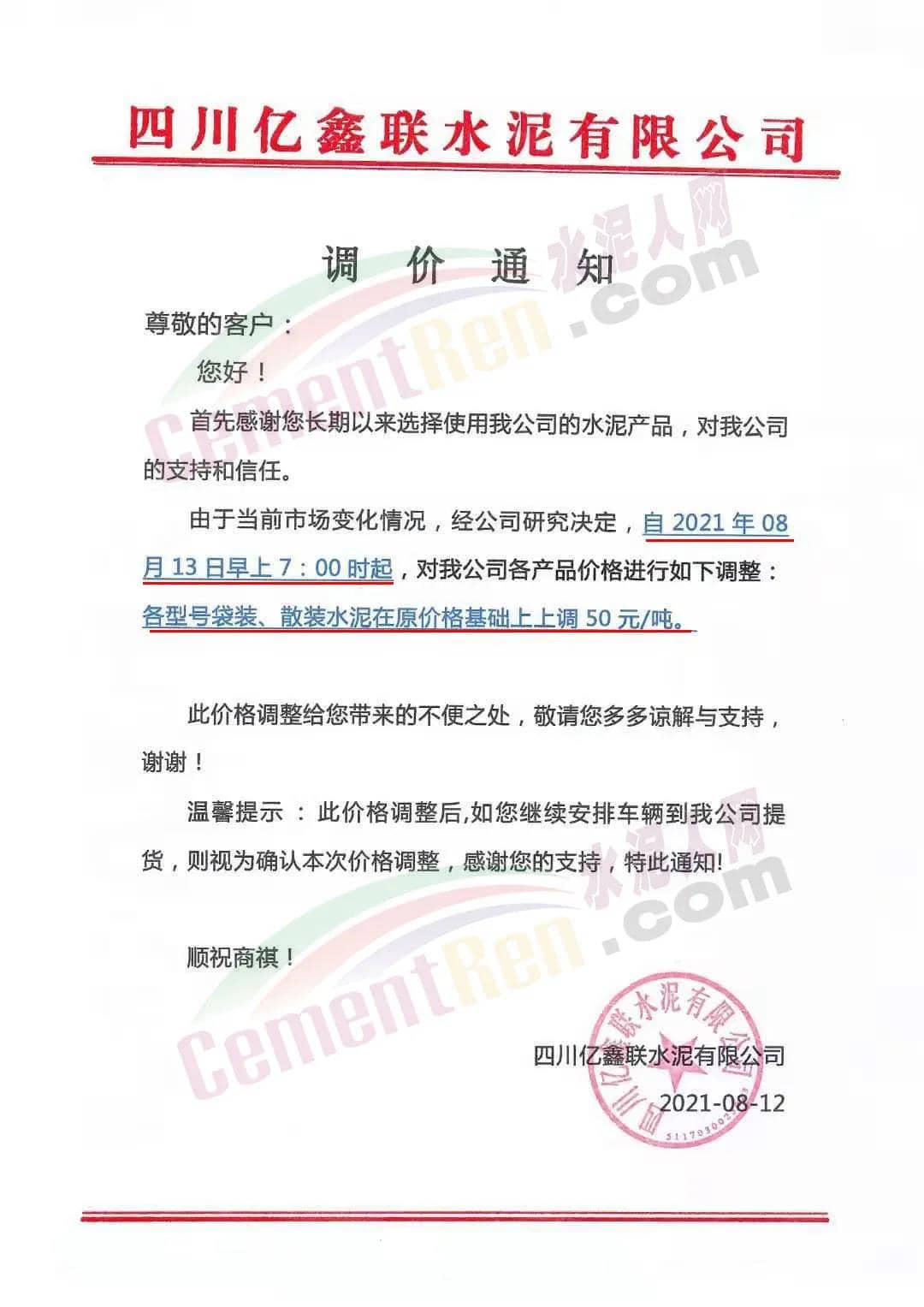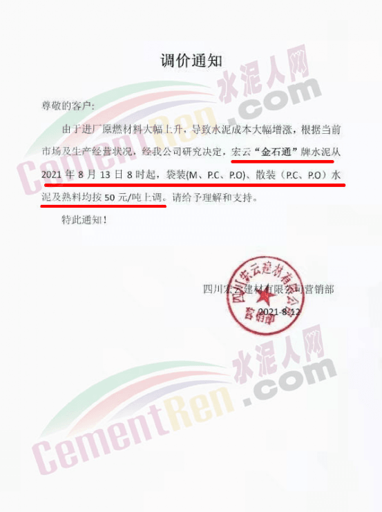 同期,水泥價格也出現(xiàn)跟漲。8月12日四川億鑫聯(lián)水泥有限公司通知,由于當(dāng)前市場變化情況,經(jīng)公司研究決定,自8月13日旱上7時起,對公司袋裝、散裝水泥在原價格基礎(chǔ)上上調(diào)50元/噸。價格調(diào)整后,如您繼續(xù)安排車輛到公司提貨,則視為確認(rèn)本次價格調(diào)整。