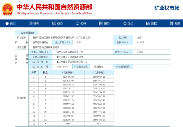 8月3日冀東水泥璧山有限責(zé)任公司以12600萬元競得重慶市璧山區(qū)福祿鎮(zhèn)浸河村趙家灣石灰?guī)r礦9.8年采礦權(quán),采礦權(quán)面積為0.237km²。