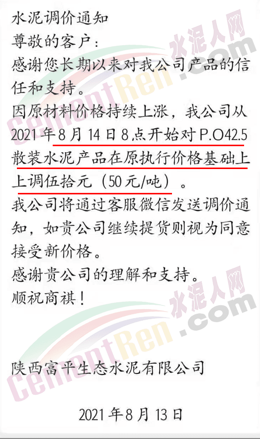 陜西富平生態(tài)水泥有限公司通知因原材料價格持續(xù)上漲,公司從2021年8月14日8點開始對P.O42.5散裝水泥產(chǎn)品在原執(zhí)行價格基礎(chǔ)上上調(diào)50元/噸。公司將通過微信方式發(fā)送調(diào)價通知,如繼續(xù)提貨則視為同意接受新價格。