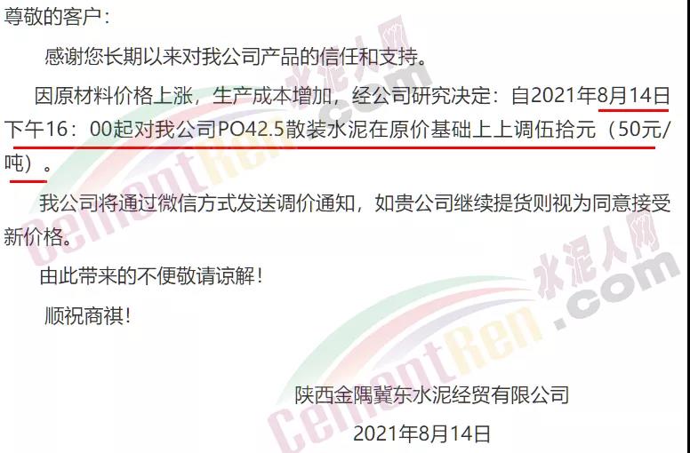 陜西金隅冀東水泥經(jīng)貿(mào)有限公司通知,因原材料價格上漲,生產(chǎn)成本增加,經(jīng)公司研究決定,自2021年8月14日下午16時起PO42.5散裝水泥在原價基礎(chǔ)上上調(diào)50元/噸。公司將通過微信方式發(fā)送調(diào)價通知,如繼續(xù)提貨則視為同意接受新價格。