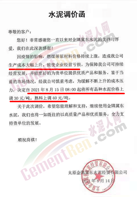 日前,太原金隅冀東有限公司通知因疫情的影響,燃煤等原材料價(jià)格持續(xù)上漲,造成公司生產(chǎn)成本大幅上升,致使企業(yè)經(jīng)營虧損。為保障公司可持續(xù)經(jīng)營發(fā)展,并能更好的為客戶提供優(yōu)質(zhì)產(chǎn)品和服務(wù)。鑒于當(dāng)前的市場情況,經(jīng)公司慎重考慮,為緩解不斷上升的成本壓力,決定自2021年8月15日08時(shí)起將所有品種水泥價(jià)格上調(diào)30元/噸,熟料上調(diào)40元/噸。