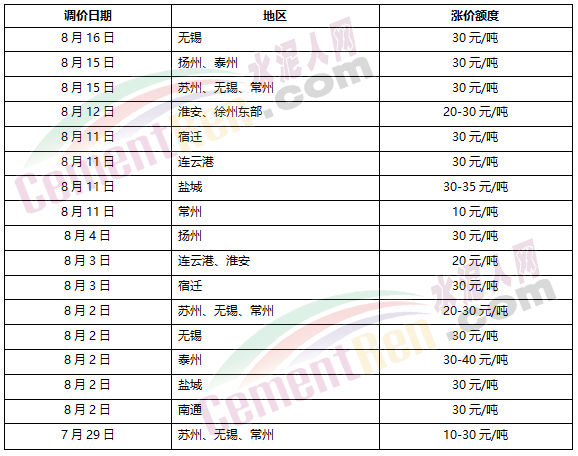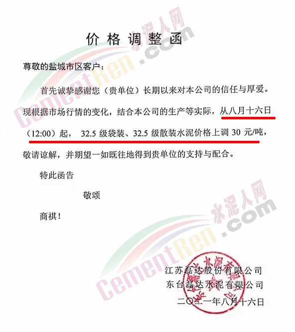 江蘇磊達(dá)水泥通知,根據(jù)市場行情變化,結(jié)合公司生產(chǎn)實(shí)際,從8月16日12時(shí)起上調(diào)32.5級袋裝及散裝水泥價(jià)各30元/噸。