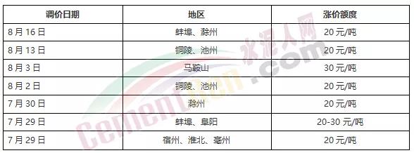 自7月下旬安徽滁州、蚌埠、蕪湖等多區(qū)域熟料價(jià)格率先上調(diào)15-30元/噸,帶動(dòng)水泥價(jià)格上漲,多區(qū)域已經(jīng)連續(xù)兩輪上調(diào)價(jià)格,累計(jì)上調(diào)40-50元/噸。漲價(jià)后,省內(nèi)各企業(yè)報(bào)價(jià)在380-470元/噸,其中蚌埠海螺水泥PO42.5散裝水泥報(bào)價(jià)440元/噸,銅陵上峰水泥報(bào)價(jià)435元/噸,蕪湖海螺水泥報(bào)價(jià)470元/噸,宿州海螺、蕭縣天瑞報(bào)價(jià)380元/噸。