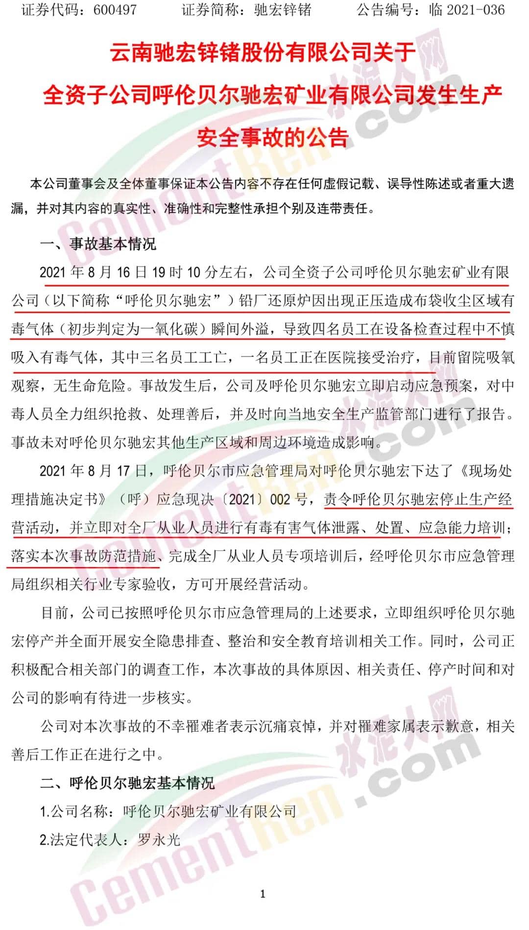 事故發(fā)生后,馳宏鋅鍺及呼倫貝爾馳宏立即啟動應(yīng)急預(yù)案,對中毒人員全力組織搶救、處理善后,并及時向當(dāng)?shù)匕踩a(chǎn)監(jiān)管部門進(jìn)行了報告。