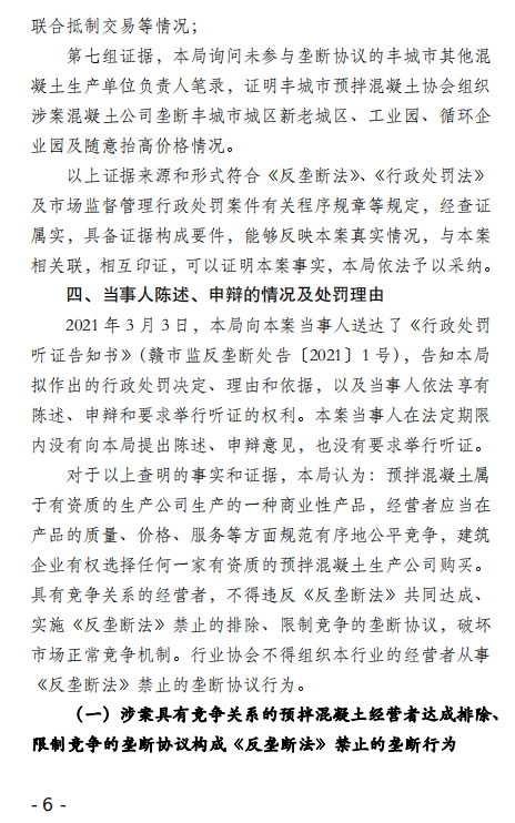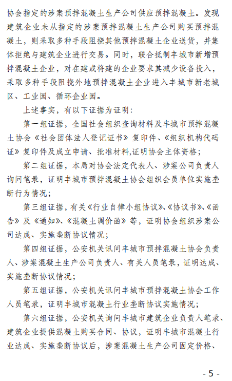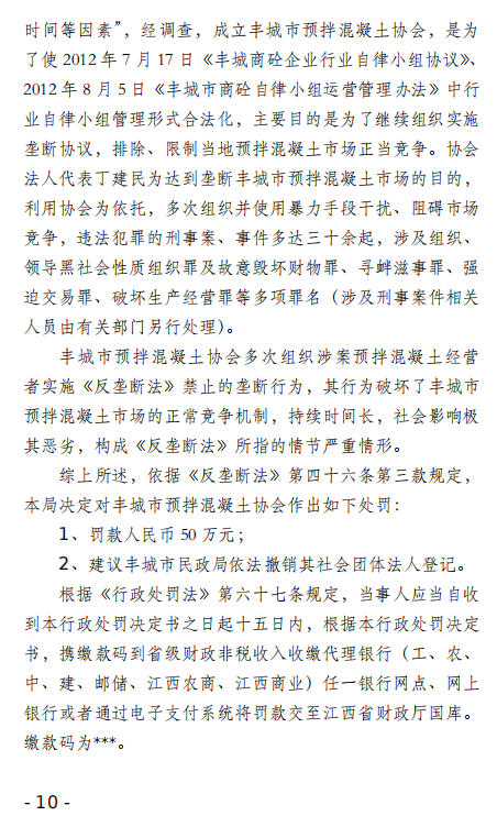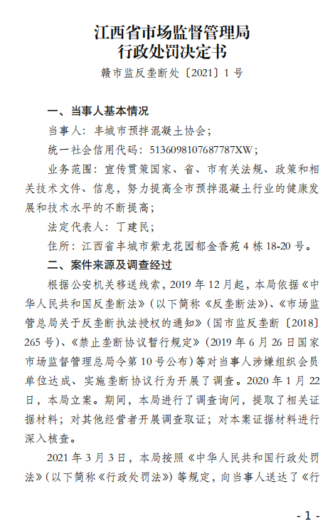 經(jīng)調查,2021年7月23日,江西省市場監(jiān)督管理局對豐城市預拌混凝土協(xié)會作出罰款50萬元的行政處罰,并建議豐城市民政局依法撤銷其社會團體法人登記;對豐城市閩邑建材公司等6家會員企業(yè)責令停止違法行為,沒收違法所得,并處2018年銷售額8%的罰款;對豐城市晨峰建材公司等2家會員企業(yè)責令停止違法行為,沒收違法所得,并處2018年銷售額3%的罰款。上述罰沒款共計2.86億元。