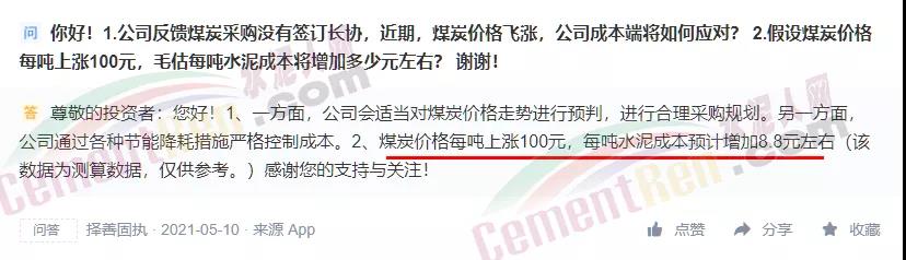 塔牌管理層則表示:煤炭價格每噸上漲100元,每噸水泥成本預(yù)計增加8.8元左右。且各企業(yè)采購煤炭質(zhì)量、生產(chǎn)水泥質(zhì)量等級不同,測算出來的產(chǎn)品煤耗成本會存在差異。